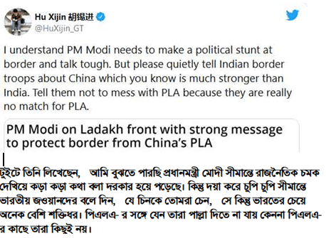কিন্তু এতে চীনা প্রতিক্রিয়াটা ধরা পড়ে যখন চীনা গ্লোবাল টাইমসে এক প্রফেসর আর্টিকেল লিখে বলেন, ভারতের প্রধান সমস্যা হল ‘উগ্র জাতিবাদ’। মানে তিনি বলতে চাইছেন মোদী সরকার চীনের বা পাকিস্তানের বিরুদ্ধে – এই করে ফেলবে, সেই করে ফেলবে, বোমা মেরে উড়িয়ে দেবে, মুখ তোড়া জবাব দিব অথবা একমাত্র ৫৬ ইঞ্চি ছাতির মোদী এমন জবাব দিতে পারেন – ইত্যাদি এ ধরনের ‘উগ্র জাতিবাদ’ উস্কানি দিয়ে ভোটের ইস্যু বানানোতে মোদী এক ওস্তাদ লোক অথচ পুরো ব্যাপারটাই বানোয়াট। এতে সমস্যা হল, যদি কখনো সত্যিকার পরিস্থিতি আসে আর মোদী কিছুই করতে পারেন না অবস্থা হয়, তা হলে মোদী ইজ্জত-সম্মান হারানো এক ভয়ঙ্কর লোক হিসেবে হাজির হয়ে যান ও যাবেন। তাই ব্যাপারটা নিয়ে চীন এতই বিরক্ত যে, এবারের বিশ ভারতীয় সেনার বিপরীতে চীনা আহত-নিহতের ফিগারটা কী তা সে এখনও একেবারেই প্রকাশ করেনি। যেন মোদী ও তাঁর দল এনিয়ে কোন নির্বাচনী বীরত্বগাথা গল্প তৈরি না করতে পারে সেজন্য। যেমন লাদাখে যারা মার খেয়েছে তারা ভারতের বিহার রেজিমেন্টের। তাই ভারতের অন্তত একজন পত্রিকা সম্পাদক ইতোমধ্যে টুইটে বলে বসেছেন আগামি বছর বিহারে রাজ্য নির্বাচন – তাই সেখানে যেন ঐ বিহার রেজিমেন্টের ‘উগ্র জাতিবাদী মিছা বীরত্বের গল্প” নির্বাচনে ভোট পাবার ইস্যু না করা হয়।