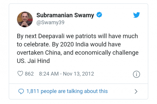 পাঁড় হিন্দুত্ববাদী সুব্রামনিয়াম স্বামী ২০২০ সালের মধ্যে ভারত পরাশক্তি হবে, বলেছিলেন ২০১২ সালে।