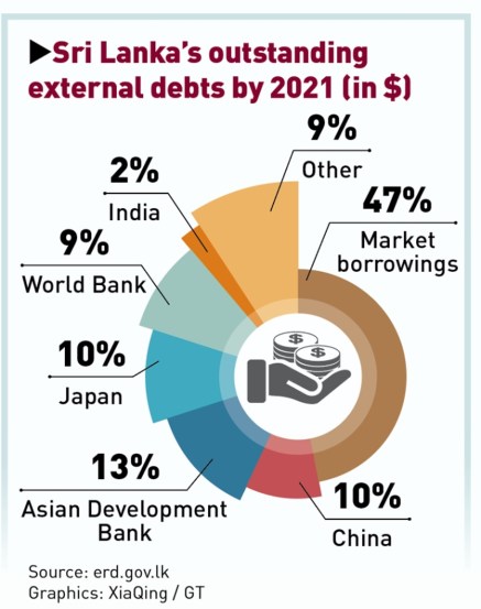 এ ছাড়া একই প্রপাগান্ডা চালাচ্ছে ভারতের আইপি টিভি (প্রথম কলকাতা) বা সোশ্যাল মিডিয়া টিভি অথবা ফেসবুক ধরনের সোশ্যাল মিডিয়া ইত্যাদি, এসব জায়গায় গেঁথে বসা প্রপাগান্ডা ধারণাটা হল, সেই পুরানা গল্প – চীনা ঋণের কারণেই শ্রীলঙ্কা অর্থনীতির আজ এ দুর্গতি। অথচ এটা ভিত্তিহীন।