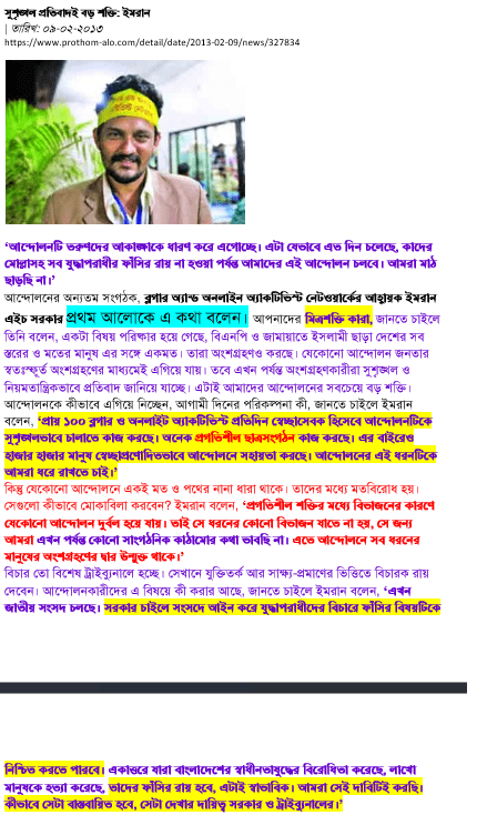 এমন অনেক লেখা এখনও পাবেন। আর ভাষ্যগুলো খেয়াল করেন। কথিত শাহবাগী আন্দোলনের ইমরান এইচ সরকার, তিনিও আসলে ছিলেন President at Youth for Peace & Democracy, Bangladesh (YPD)এই [YOUTH PROGRAM] মানে আরব স্প্রিংয়ের সাথে জড়িত নেতা। তাকে আমেরিকানেরা পুশ করে শাহবাগে পাঠিয়েছিল। প্রথম আলো এনিয়ে দুটা ফিচারও ছেপেছিল।
