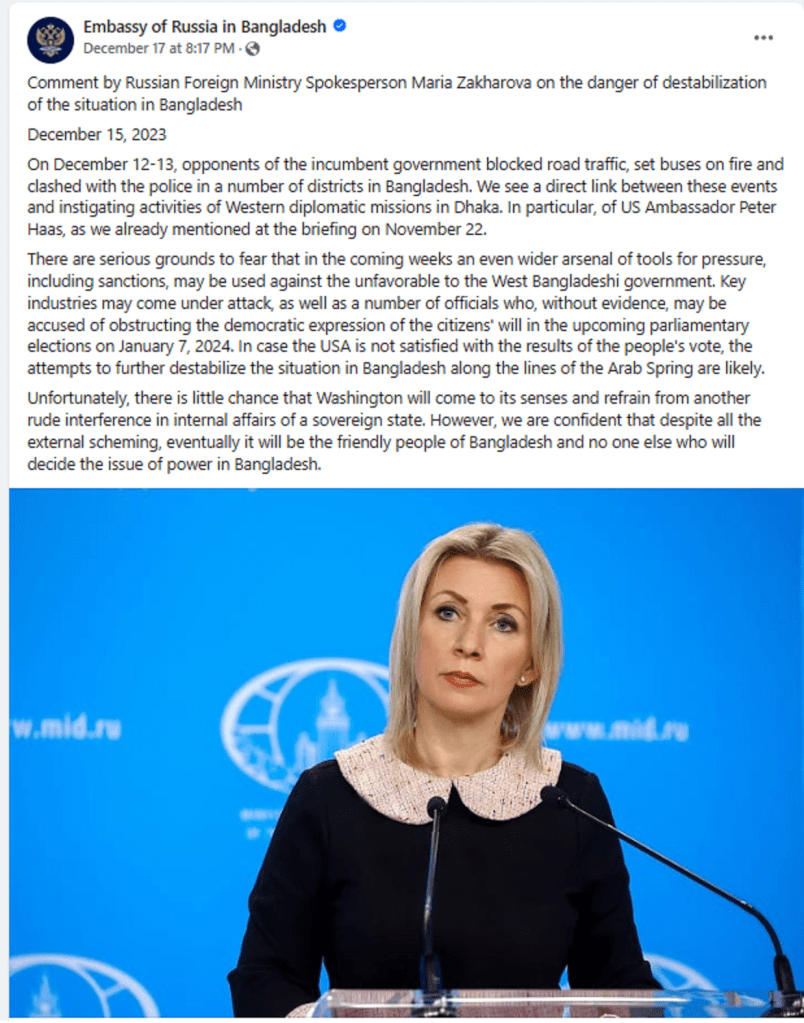 এমনিতেই সবচেয়ে বড় কথা মুখপাত্রের জাখারভা কথিত বিবৃতি যেই দিয়ে থাকুক এটা সীমা ছাড়ানি। ঐ বিবৃতি লিখেছে – “গত ১২-১৩ ডিসেম্বর বাংলাদেশে সরকারবিরোধীরা রাস্তাঘাট অবরোধ করে, যানবাহনে আগুন ধরিয়ে দেয় এবং পুলিশের সঙ্গে সংঘর্ষে লিপ্ত হয়”। এই বক্তব্য একেবারে খুবই এক্তিয়ার বহির্ভুত। ফলে এটা রাশিয়ার প্রমাণিত হস্তক্ষেপ। কারণ, রাশিয়া কিভাবে নিশ্চিত হল যে গত ১২-১৩ ডিসেম্বর বাংলাদেশে সরকারবিরোধীরা রাস্তাঘাট অবরোধ করে, যানবাহনে আগুন ধরিয়ে দিয়েছে??? এটা রাশিয়ার কেউ কিভাবে জানল, নিশ্চিত হল? কোন জুডিশিয়াল তদন্ত কী হয়েছে? কে করেছে? তদন্তকারীদের সাথে রাশিয়ার যেকেউ এর কী সম্পর্ক? কী এক্তিয়ার??? ঢাকার রাশিয়ার দুতাবাসের আমেরিকা হস্তক্ষেপের অভিযোগ তুলেই চলেছে।
